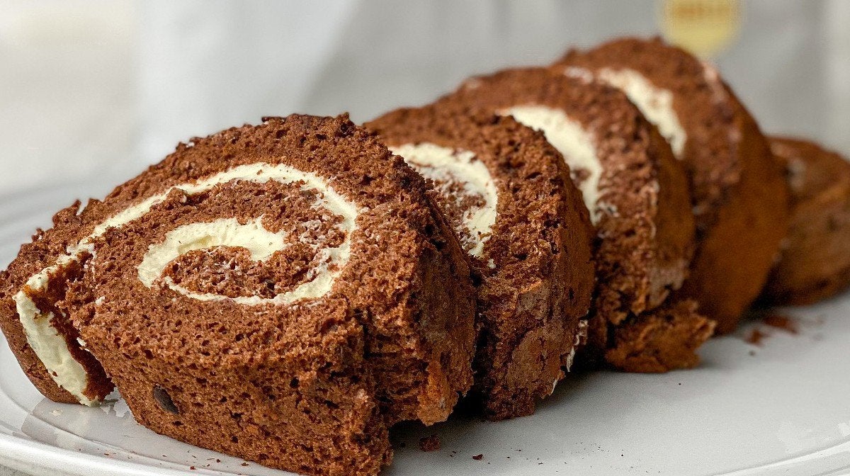 - Verdeel de room gelijkmatig over de spons en rol voorzichtig. Bestrooi met nog wat cacaopoeder om te decoreren en serveer!