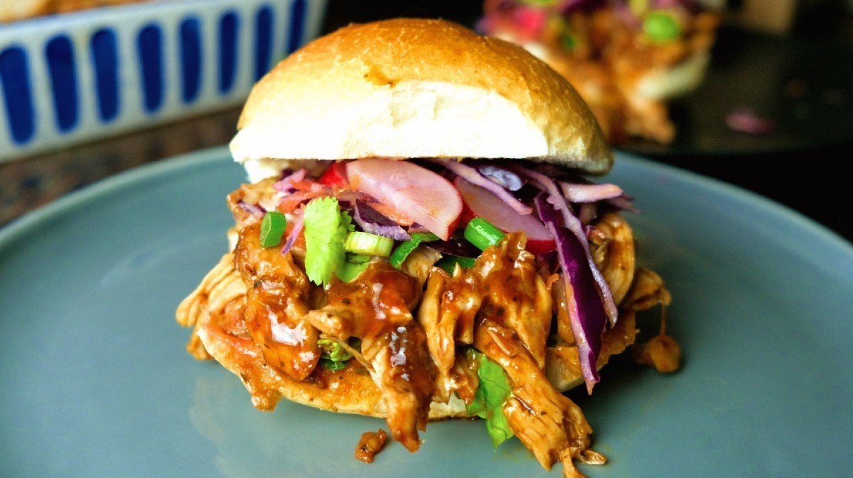 - Nu ben je klaar om je sandwiches te bouwen - breng ongeveer een theelepel lichte mayonaise aan op de bodem van je broodje, stapel dan met veel pulled BBQ-kip, top met salade en de koriander en lente-uitjes. Bon appetit!