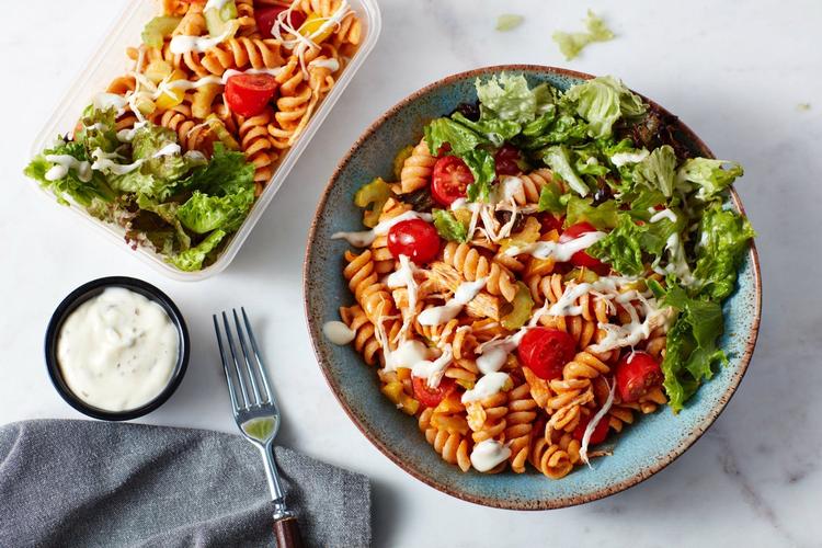 Giet de buffelsaus erover en schep deze door de pastasalade. Verdeel over 3 meal prep containers en besprenkel ze met een beetje ranchdressing en serveer met een handvol gemengde bladeren of je favoriete bijgerecht. Zet maximaal 3 dagen in de koelkast en geniet ervan warm of koud.