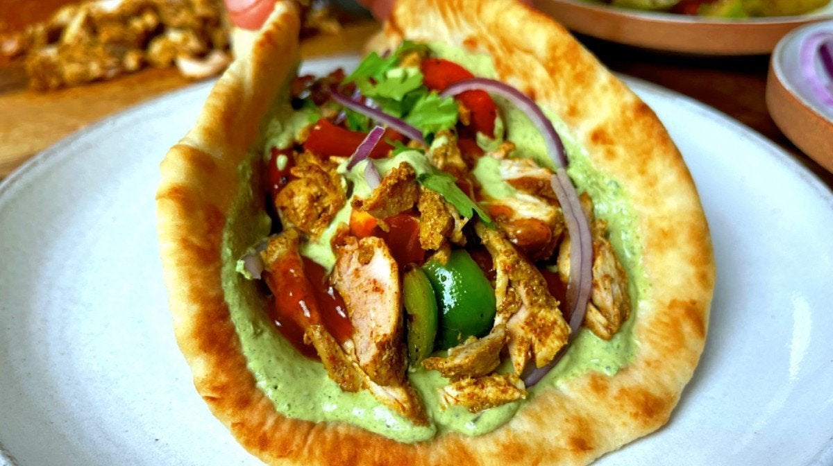 - Snijd je kippendijen in dunne reepjes. Zorg ervoor dat de rest van je garnituren klaar zijn om te serveren en bouw dan je gyros. Voeg eerst een royale hoeveelheid munt-yoghurtsaus toe aan de basis van je flatbread, en schep vervolgens de kip, paprika, plakjes rode ui en tomaten erop. Top met mangochutney en koriander - en geniet van een echt episch recept.