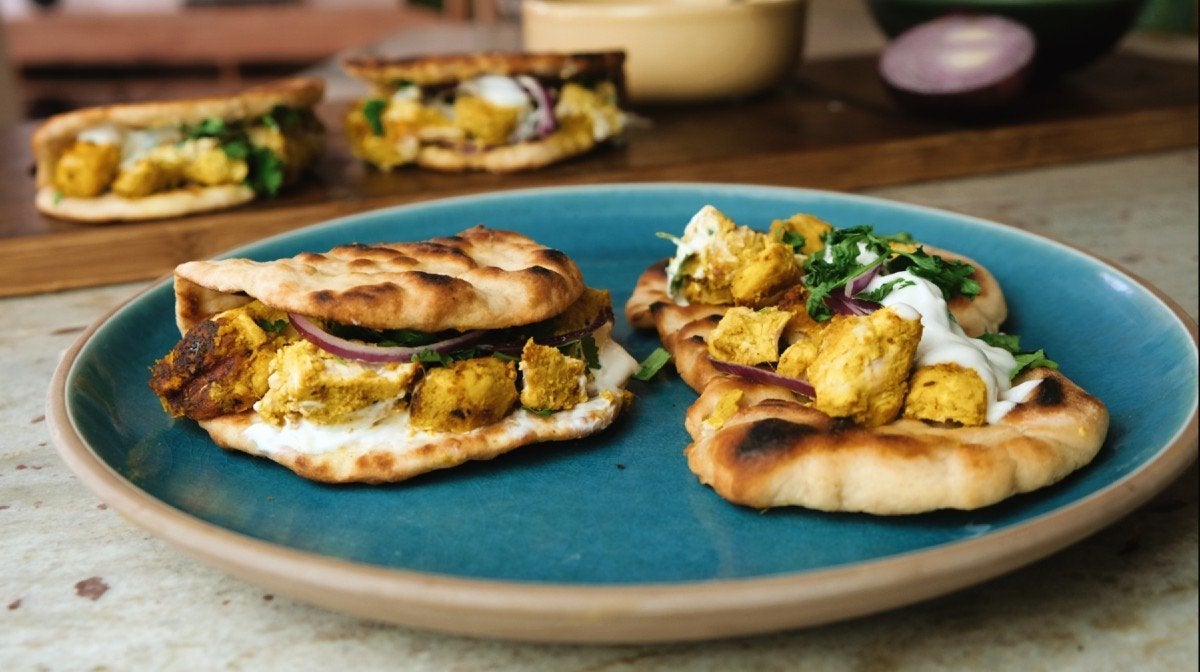 Om te serveren, voeg de kip tikka toe aan naans, bedek vervolgens met Griekse yoghurt, koriander en plakjes rode ui, en vouw dan in een heerlijke chicken tikka naan roll. Genieten!