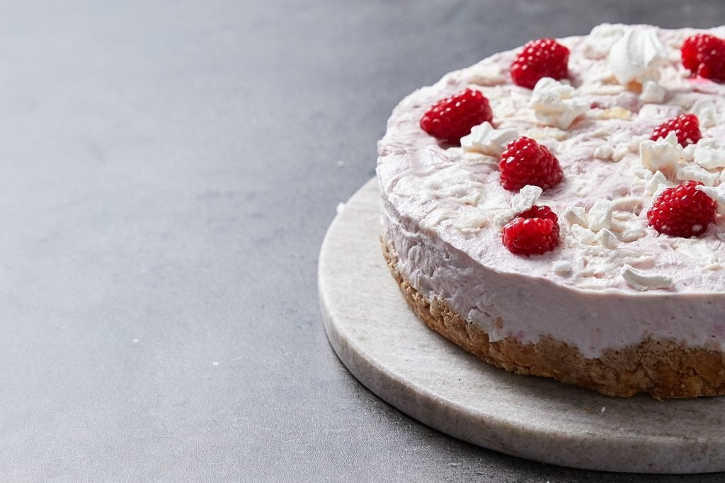 Voeg in een grote kom de yoghurt, Impact Whey (Eton Mess) en 100 g frambozen toe (bewaar wat apart om de cheesecake later te bedekken). Gebruik een staafmixer om alles door elkaar te mengen tot een glad mengsel en giet dit dan over je koekjesbodem. - Gebruik een spatel om de cheesecake-vulling gelijkmatig over de bodem te smeren en verkruimel een van de schuimgebakjes erover. Leg de overgebleven frambozen erop en vries dan minimaal 4 uur in (bij voorkeur een nacht).