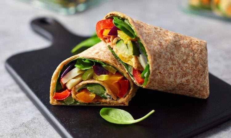 Maak een strakke omslag door eerst twee tegenover elkaar liggende zijden van de tortilla om te vouwen en vervolgens vanaf de onderkant op te rollen. Snijd diagonaal in plakjes en wikkel ze in folie of neem ze gelijk mee als lunch!