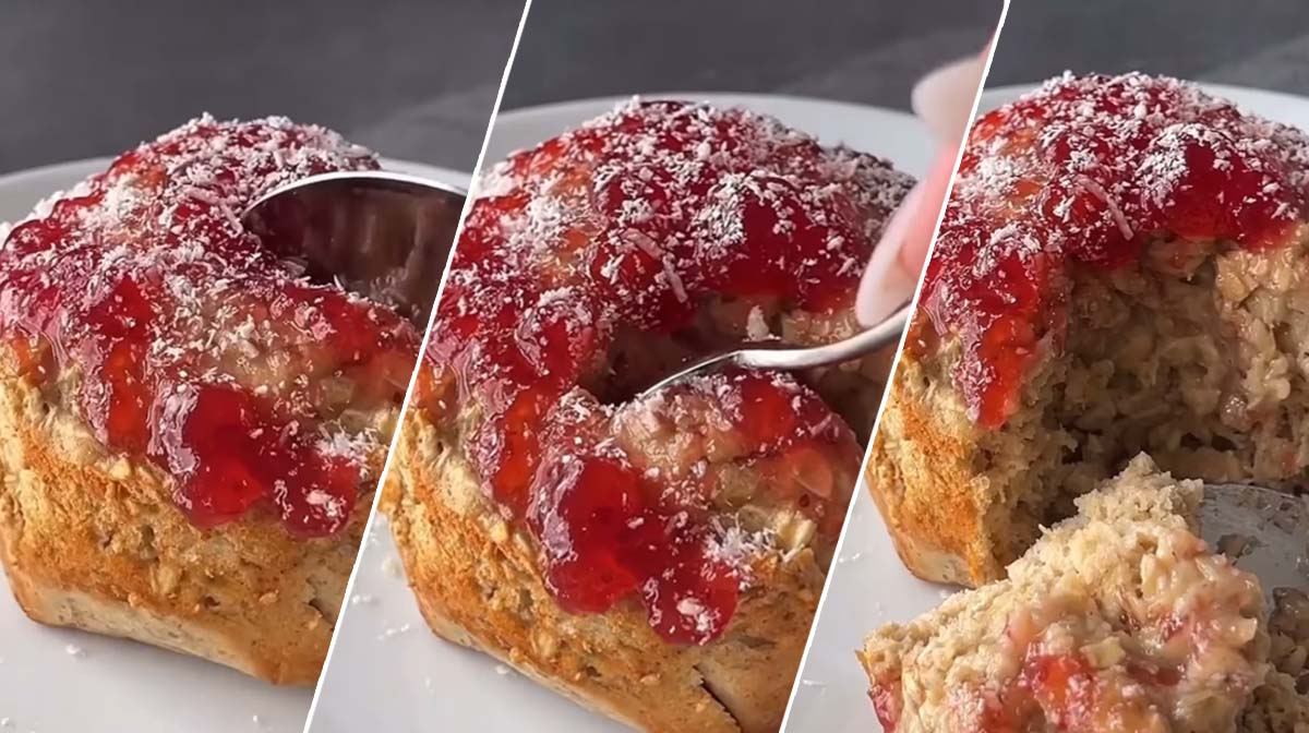 Laat een paar minuten afkoelen en garneer met jam en gedroogde kokosnoot.