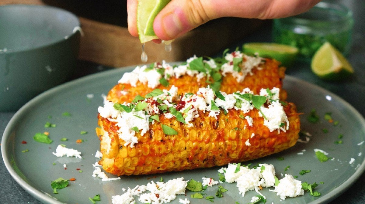 - Strooi geraspte feta over de gegrilde maïs, garneer met chilivlokken en koriander, werk af met een flinke scheut limoen en geniet!