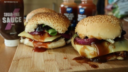 6) Haal uit de oven en bouw je hamburgers! Wij hebben sesamzaadburgerbroodjes, een paar slablaadjes en plakjes tomaat en veel BBQ-suikervrije saus gebruikt!