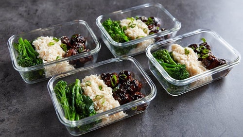 3. Voeg vervolgens de uitgelekte zwarte bonen en de salsa toe en meng goed om te combineren in de pan. Laat het een paar minuten koken en verdeel het dan met de gekookte rijst in je meal prep containers. Garneer met verse koriander en een partje limoen.