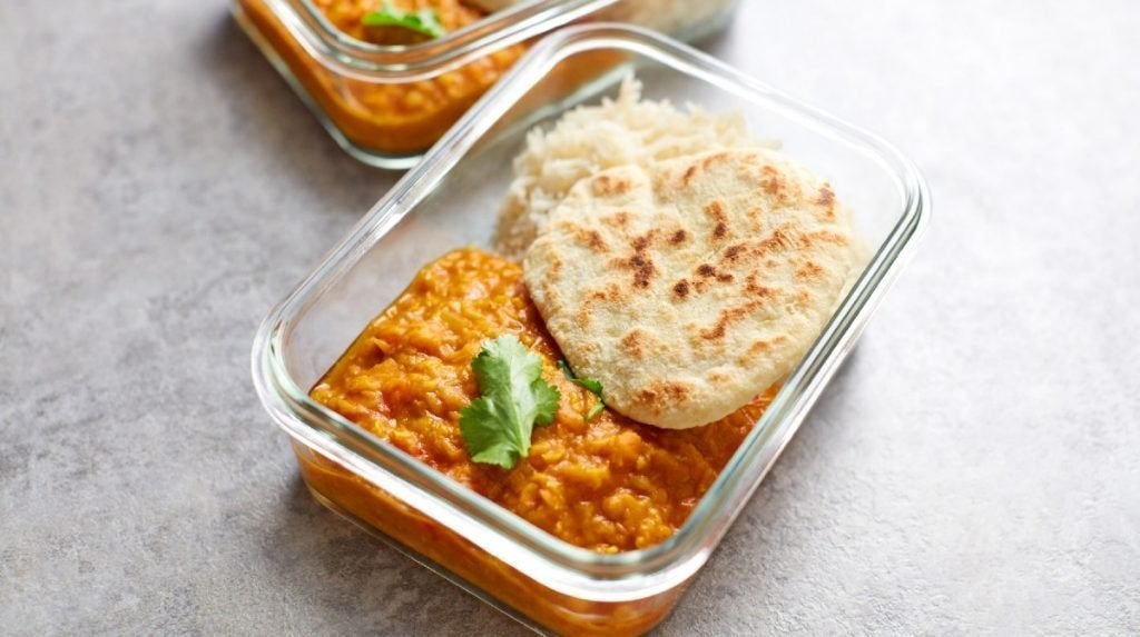 Zodra je linzen Dahl met één pot gaar is, roer je goed en voeg je ze toe met rijst in maaltijdcontainers. Voeg een mini-naan toe en garneer met koriander.