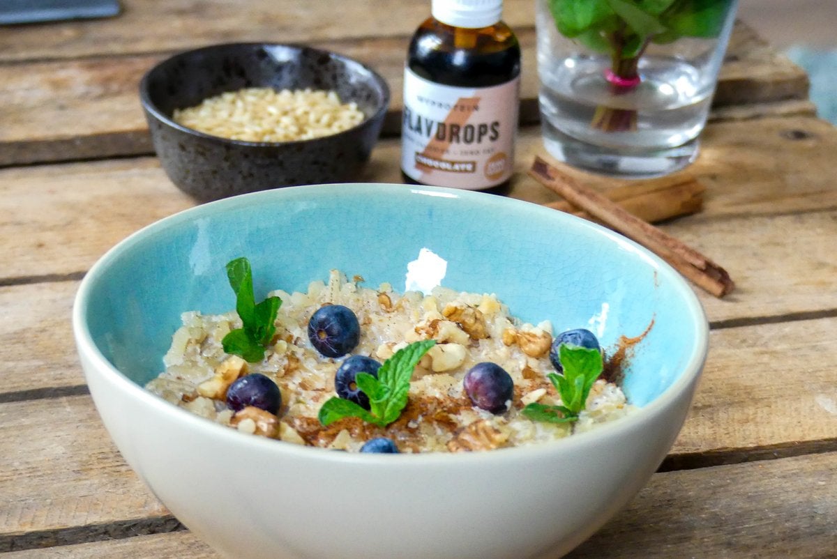 Zet een steelpannetje op het vuur en doe hier de rijst samen met de melk in. Voeg ongeveer 6 tot 8 druppels chocolade smaak flavdrops toe. Voeg ook de helft van de kaneel toe. Roer alles door elkaar en breng de melk aan de kook. Laat het geheel zo’n 15 minuten koken.