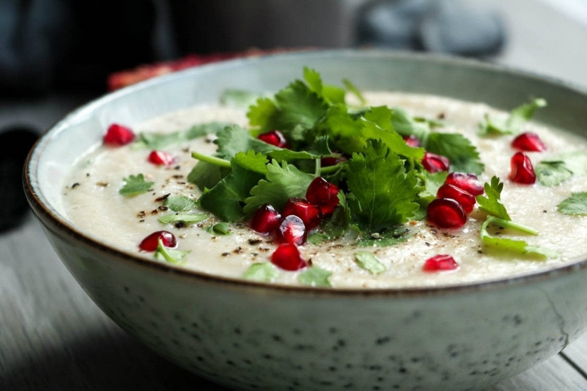Als de bloemkool gaar is, voeg je deze samen met de knoflook en de gemengde kruiden toe aan je blender en voeg je geleidelijk de bouillon toe terwijl je mixt tot een gladde en romige massa.