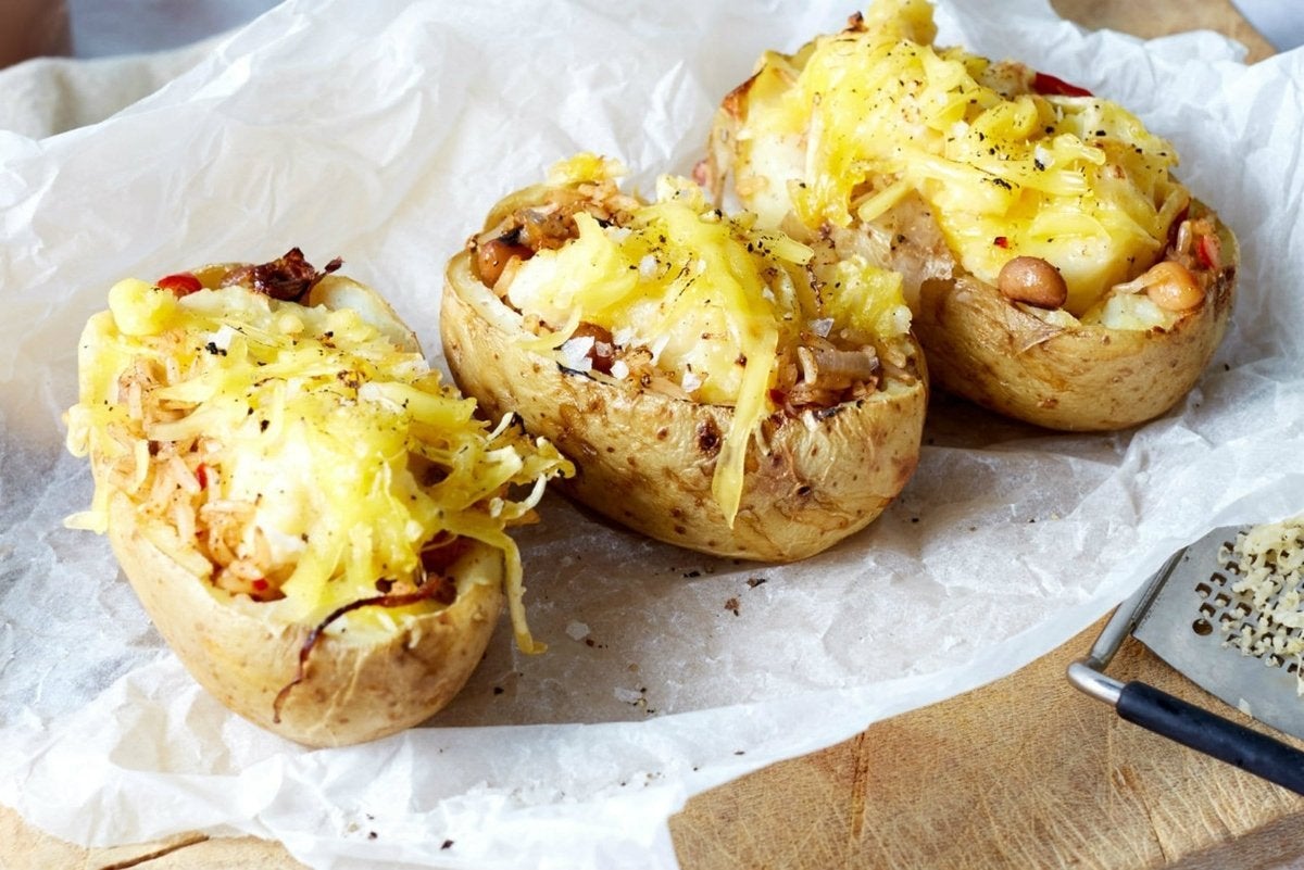5. Schep het rijstmengsel in de aardappelschillen en bedek met het kaasachtige aardappelmengsel. Grill 5 minuten op hoog vuur.