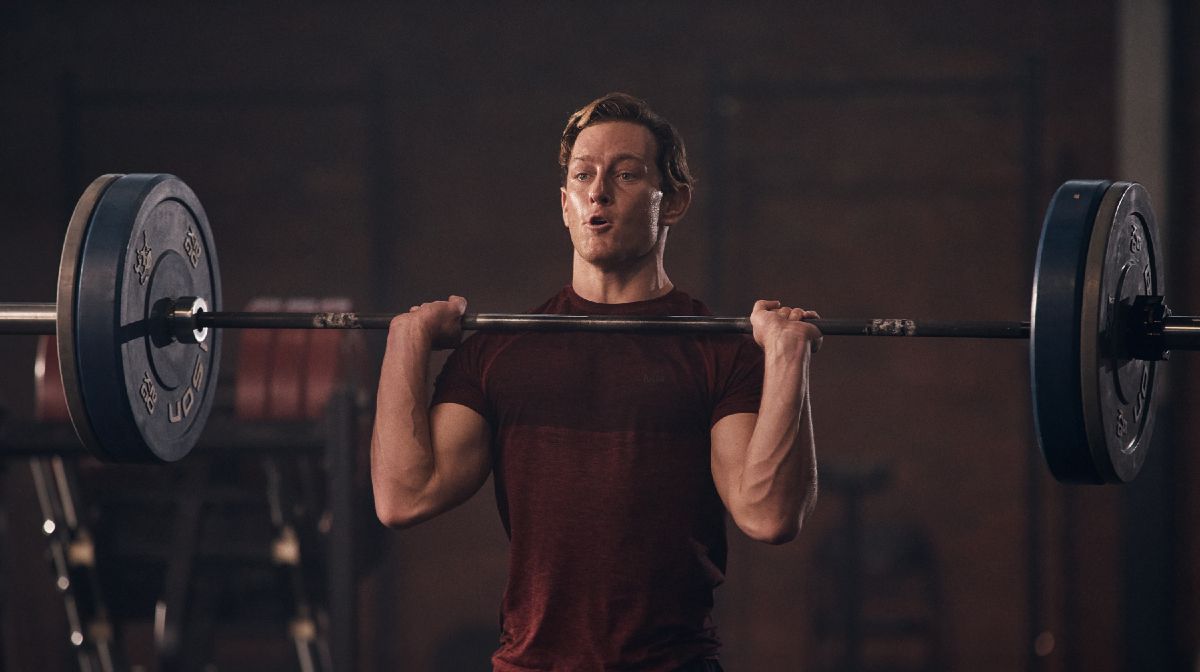 3. Duw de barbell krachtig boven je uit, waarbij je je hoofd wat achteruit tilt zodat je recht naar boven kan duwen en waarna je jezelf terug onder de stang positioneert