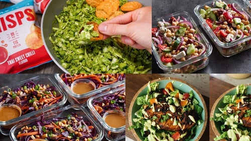 Meal prep is een gemakkelijke manier om te garanderen dat je aan je macro's voldoet - probeer deze saladerecepten om het interessant te houden.